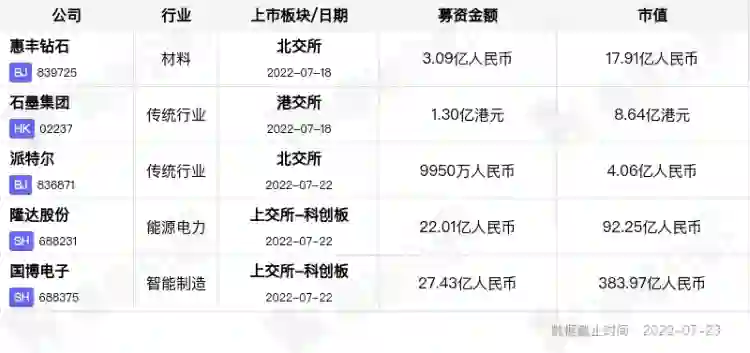 本周重点监测到国内IPO公司5家,其中2家上市地点为科创板,2家为北交所,还有1家为港交所。最新市值最高为「国博电子」383.97亿