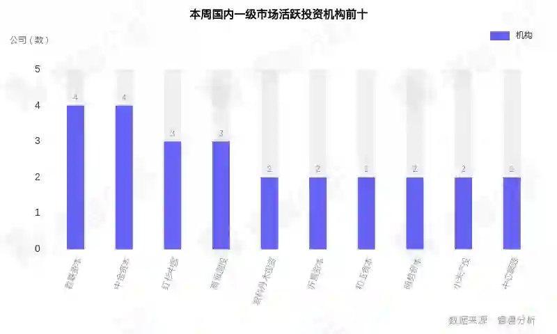 从机构投资活跃度来看,君联资本(4个)、中金资本(4个)、红杉中国(3个)、高瓴创投(3个)、君科丹木投资(2个)在本周创投市场中较为活跃。