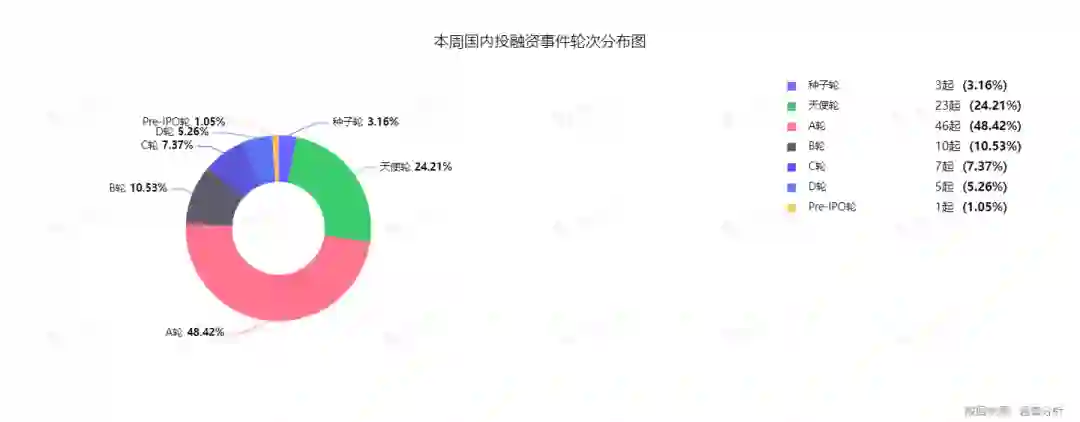 从本周披露获投企业的阶段分布来看,事件主要集中在A轮、天使轮和B轮,分别为A轮46个,天使轮23个,B轮10个。
