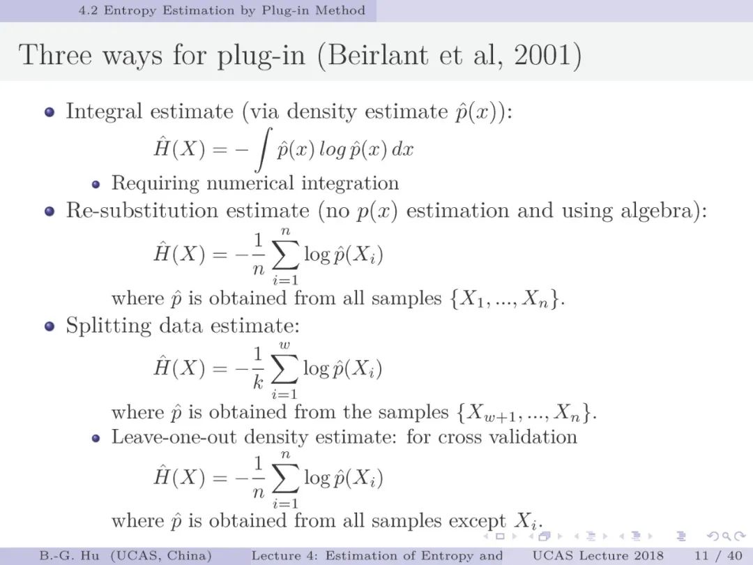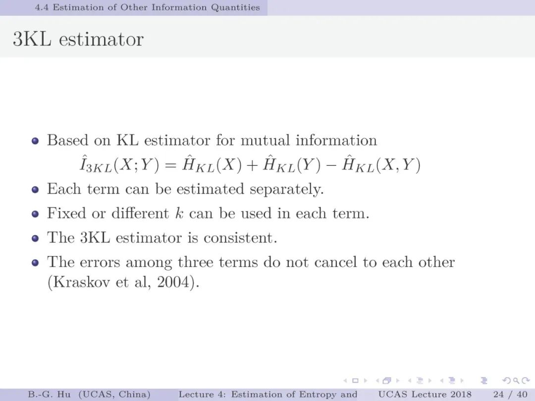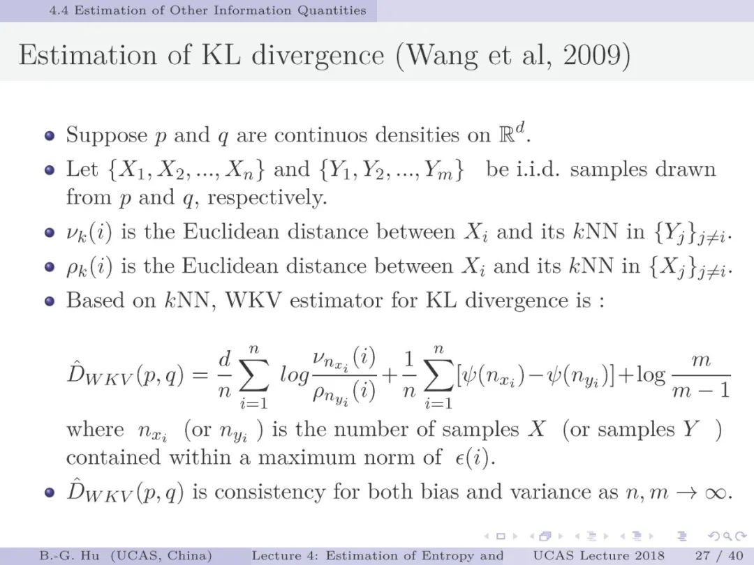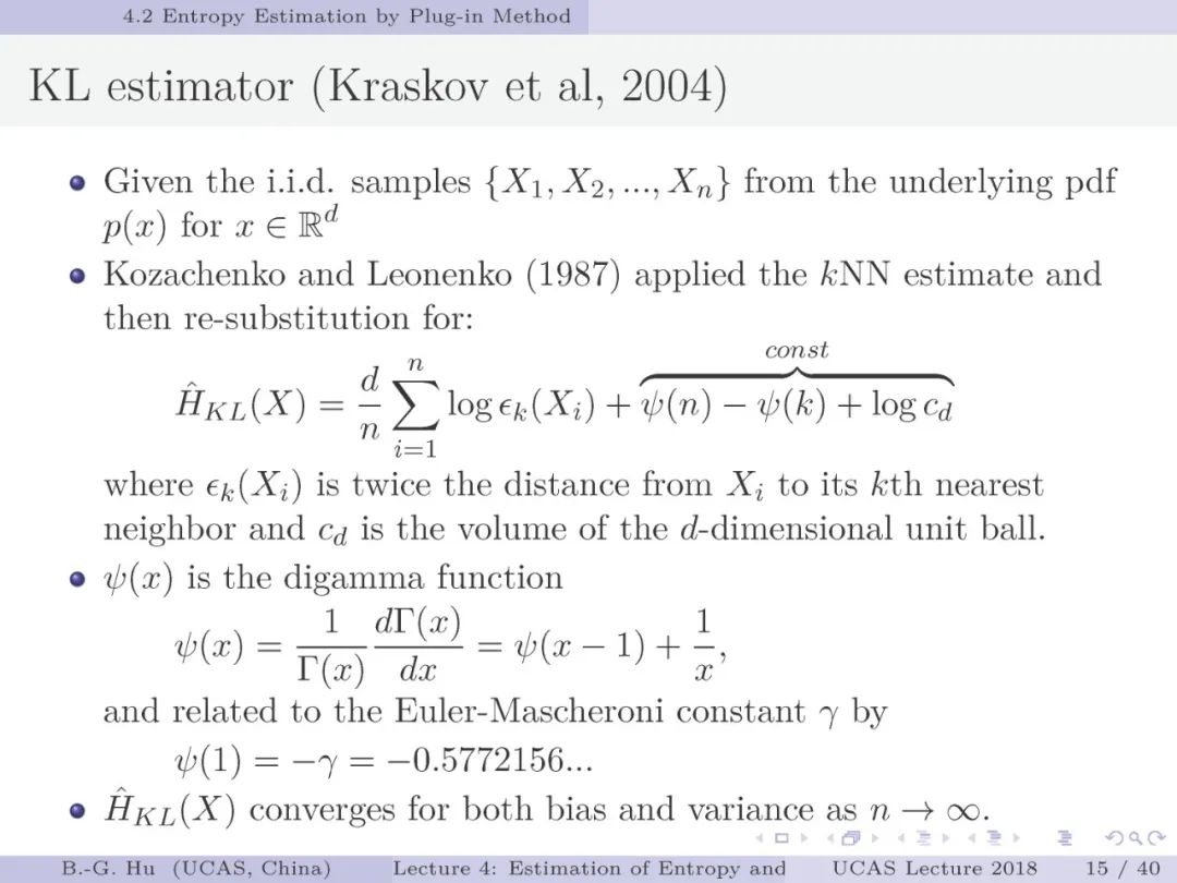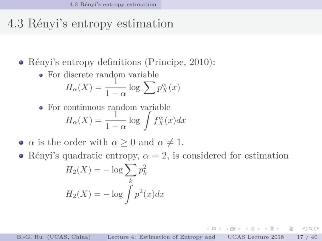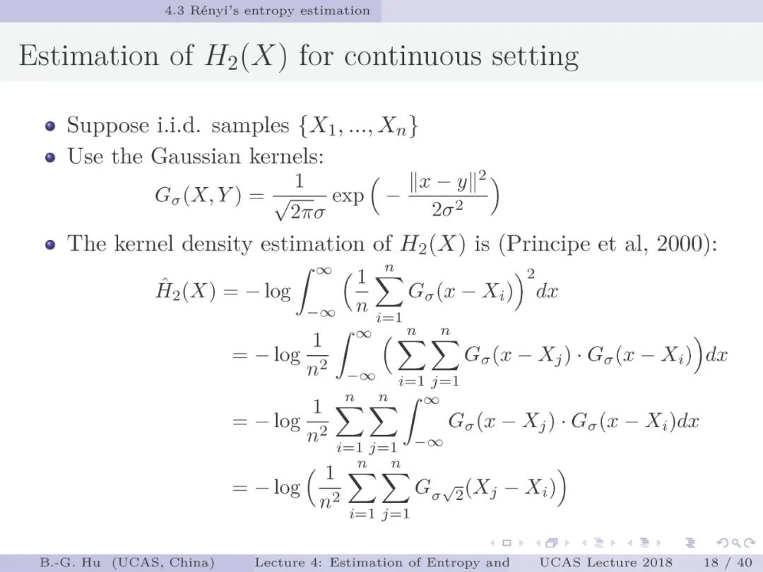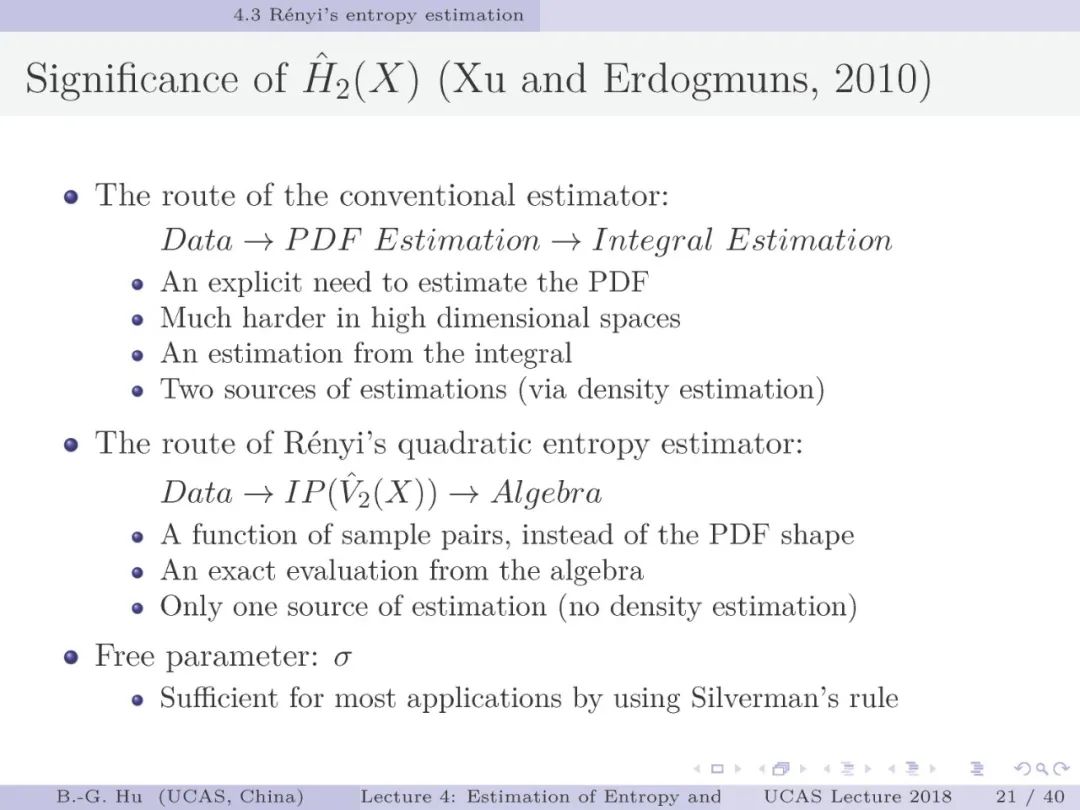 第17-22页: 在第一章中我们介绍了美国佛罗里达大学Principe教授是国际上首次提出“信息论机器学习(ITL)”理论框架的学者。基于此框架他们团队发展了许多基础性的原创工作。这里主要是他们关于二次Renyi熵中的部分贡献。其中从物理视角提出信息势、信息势场、信息力的定义(第19页),并与二次Renyi熵建立关联的学术思想十分重要并具启迪性。本人理解这是对机器学习从信息论角度提供解释性的重要基础。其中给我的启迪是未来研究要打通机器学习、信息论、物理原理之间的关联。第22页中的要点也可以理解为熵估计方法中期望的性质。