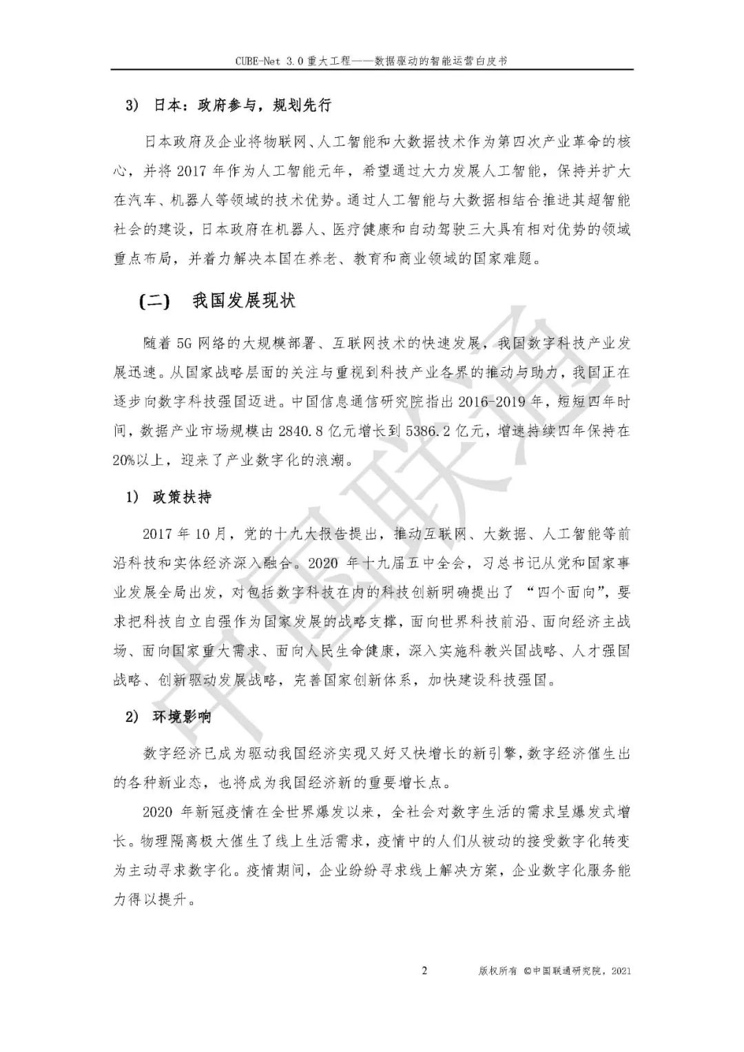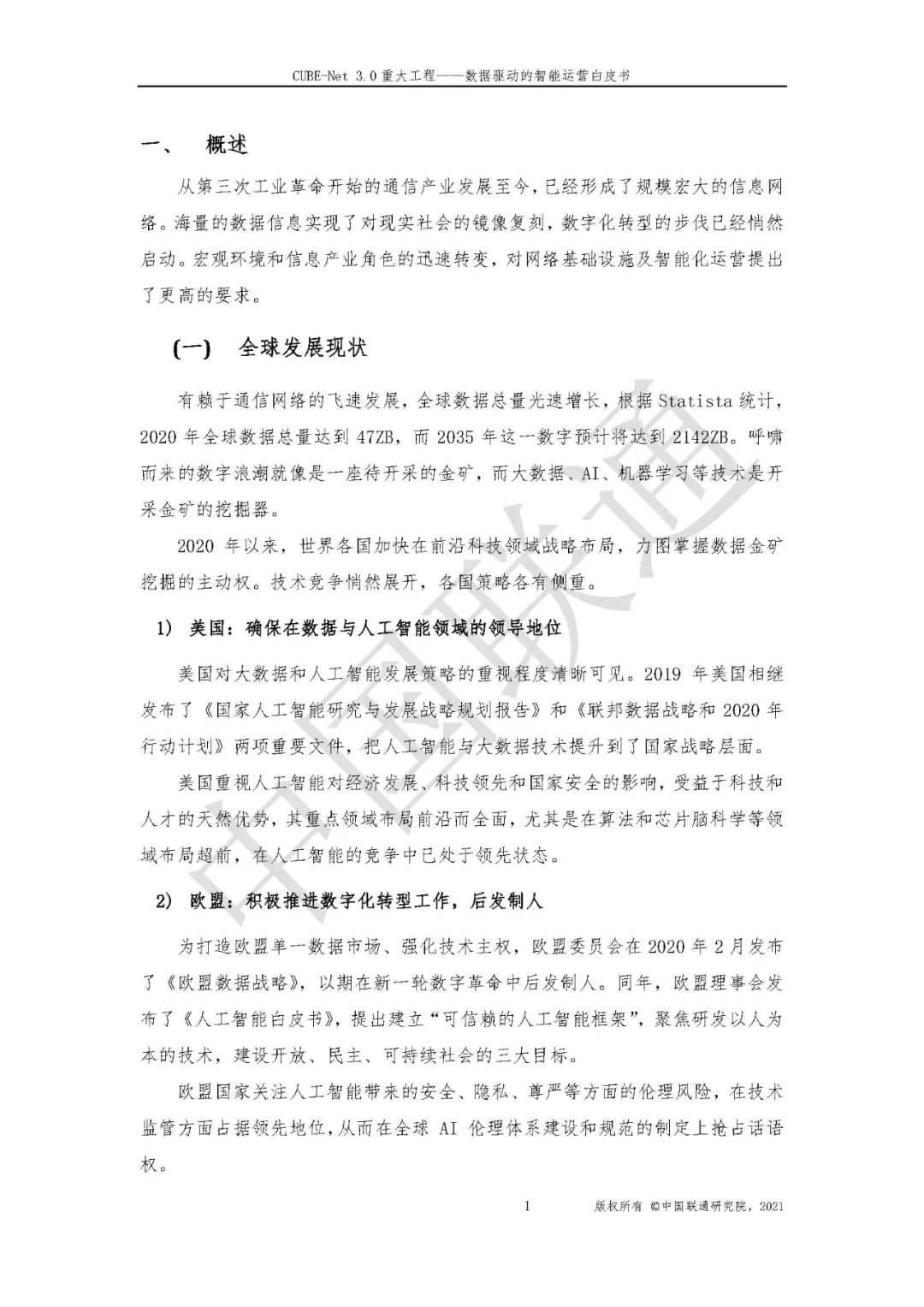 从第三次工业革命开始的通信产业发展至今,已经形成了规模宏大的信息网 络。海量的数据信息实现了对现实社会的镜像复刻,数字化转型的步伐已经悄然 启动。宏观环境和信息产业角色的迅速转变,对网络基础设施及智能化运营提出 了更高的要求。(一) 全球发展现状