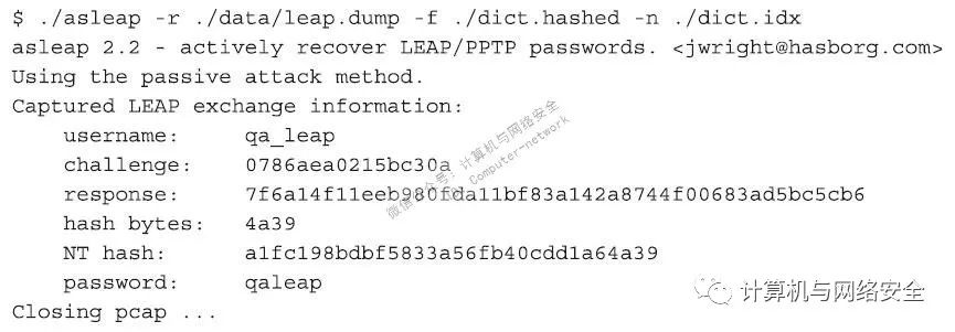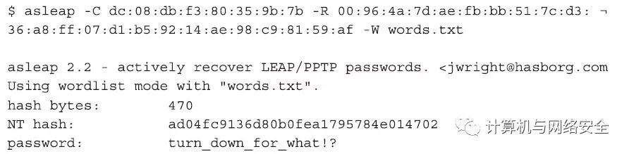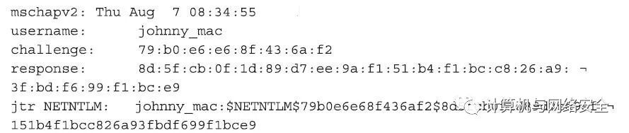 如果我们通过asleap软件运行这些结果,我们就会得出如前面Windows实例中的结论,即结果同样是“johnny_c/turn_down_for_what!?”。