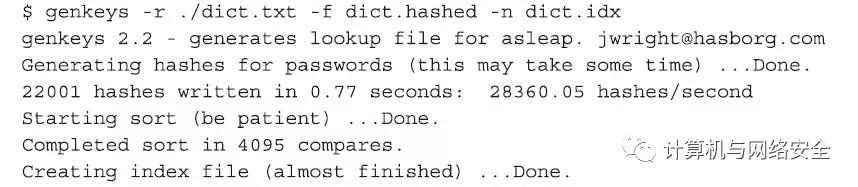“轻量级扩展认证协议”的漏洞是由Joshua Wright首次发现并展示出来。他以Asleap来命名用来展示这一漏洞的软件工具。Asleap的运行,需要先捕获一些EAP进行协议握手时的一些数据包。要完成这种捕获操作,您既可以直接使用Asleap工具本身得到,也可以通过任何其他的“嗅探器”(sniffer)得到。无论采取哪种方式,我们要做的第一件事情,就是创建一个散列字典文件(hashed dictionary file)。这个文件可以用来从任何“轻量级扩展认证协议”保护的网络中还原密码。下面创建一个散列字典文件: