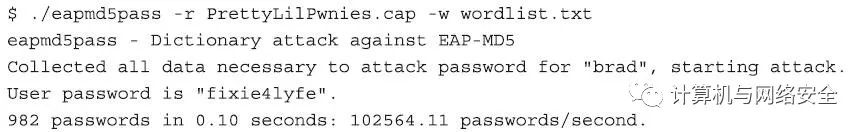 使用eapmd5pass软件破解“基于消息摘要第5版的扩展认证协议”的操作非常简单:我们指定一个捕获数据包的文件,该文件中包含MD5的“质疑”字段和“回应”字段的数据包(通过参数“-r PrettyLilPwnies.cap”来实现),再指定一个字典文件(通过参数“-w wordlist.txt”实现),然后按回车键。如果字典中包含了目标账户的密码,那么不久eapmd5pass软件将会成功地还原出这个密码。之后,使用这组账号和密码,就可以作为一个有效的用户连接到这个无线网络,并“合法”地登录。