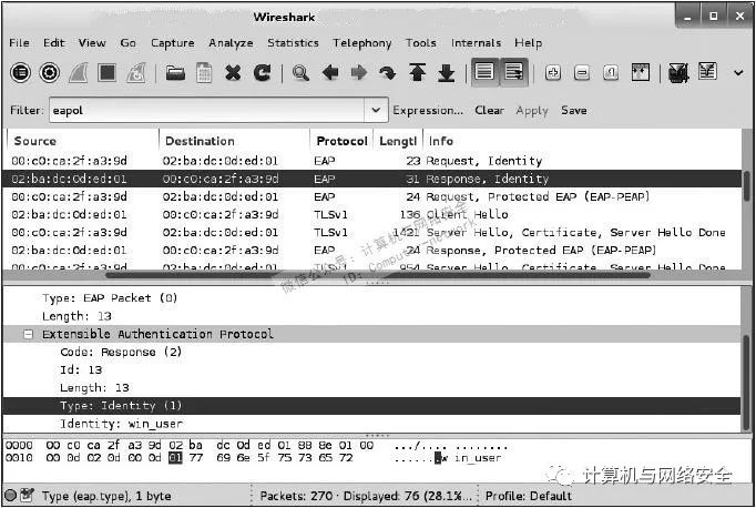 “扩展认证协议”的“身份响应”(Response Identity)的消息是客户端在“EAP握手”期间发送给“认证服务器”(authentication server)的第一条消息,消息中包含了客户端的用户名(见图1)。“认证服务器”通过实际的认证过程,可以确定该客户端发送的用户名是否可用。EAP的“身份响应”信息中有一个重要的特点,那就是该数据包是以明文方式表示的,易于辨认。如果您能够捕获到一次“EAP协议握手”数据包,那您就有可能从数据包中,得到这个正在请求连接的客户端的用户名。如果这身份认证与Windows操作系统的“系统用户”关联,那么您还可以看到的是该用户所关联的“域名”(domain)。