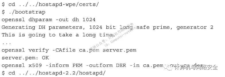 (4)最后,运行一个脚本文件,该脚本文件包含由hostapd-wpe自动生成的一些“自签名证书”(self-signed certificate)。