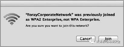 首先,让我们看看在“Wi-Fi保护访问”提供了不正确的版本的情况下,Mac的OS X上会发生什么。类似于Windows,用户收到警告提示(见图6)。