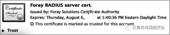 到目前为止,我们已经看到了Windows客户端在面对“骗子”RADIUS认证服务器的时候是如何表现的。下面我们通过比较的方式看看Mac的OS X客户端在遇到同样情况时的表现。