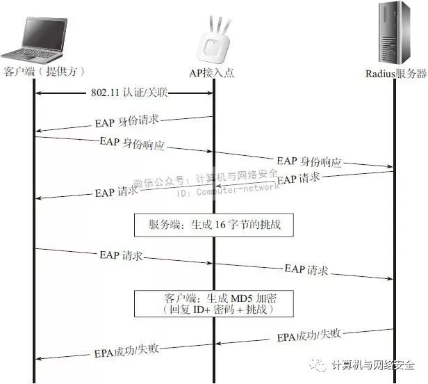 客户端在“EAP协议握手”的第一次握手的数据包中,将自己的用户名写入到了“扩展认证协议”的“身份响应”消息中。接下来,Radius服务器在收到“身份响应”消息以后,将客户端发送一个包含有标识符(identifier)字段和一个16字节的“质疑”(challenge)字段的“EAP请求”(EAP Request)以完成第二步握手。然后,客户端就将其“密码”、“标识符”字段和“质疑”字段连接起来形成一个大的字符串,并将这个字符串通过MD5加密算法进行散列运算(hash)。运算结束后,客户端将运算结果发送到Radius服务器,这就是“EAP握手”中的第三次握手,服务器会用同样的散列运算算法,将同样的几个参数进行运算,然后将运算出的结果与收到客户端的这个运算结果进行比较,如果它们匹配,则用户成功认证;否则不匹配,则认证失败。无论哪种结果,服务器都会向用户发送一个认证结果,这就是“EAP协议握手”中的最后一步。“基于消息摘要第五版的扩展认证协议”是一个简单的方法,但是它存在诸多问题,特别是在无线网络上。