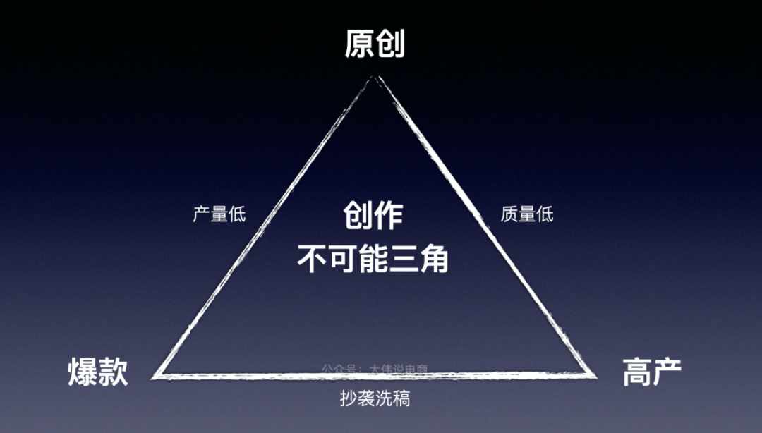 这就是内容创作的一个不可能三角模型:原创、爆款、高产。