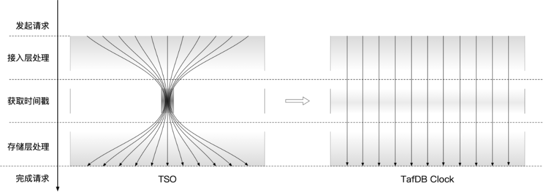 通过 TafDB Clock 我们消除了时钟的单点隐患,同时不增加额外的事务逻辑复杂度。如图所示,当使用 TSO 时,系统中所有的请求都需要挤在一起访问单点的时钟服务以获取时间戳,而单点是存在上限的,只能支撑百万 QPS 规模,并且一旦时钟服务异常就会影响集群全部的请求。而使用 TafDB Clock 方案时,所有的请求不再需要访问某个共同的节点,上述单点问题也就被消除了。
