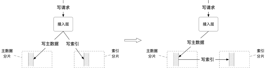 针对平坦 Namespace:我们分析发现大部分业务场景需要的二级索引不要求极致的时效性。基于这个特点我们实现了一种机制来异步写入索引数据,以略微降低索引时效性为代价,将绝大部分写入都控制在单个分片上。如图所示,原本一个写入需要同时完成主数据和索引数据的写入,需要通过分布式事务同时完成两分片操作。而优化后,由于无需同时写入索引数据,系统只需完成主数据分片的数据写入后就可返回。
