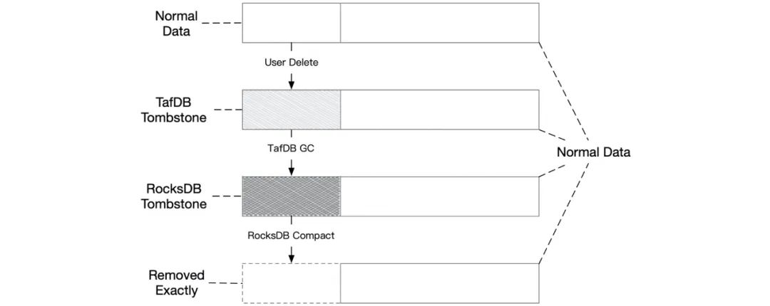 为了保证事务的实现,TafDB 采用多版本的数据存储设计,与 RocksDB 类似,也使用标记删除的方式。被标记的垃圾数据最终会通过 GC(多版本垃圾回收)机制异步完成其在 RocksDB 中的删除。不过如上所述,磁盘上数据的实际删除还要等待 RocksDB 的 compaction 完成。