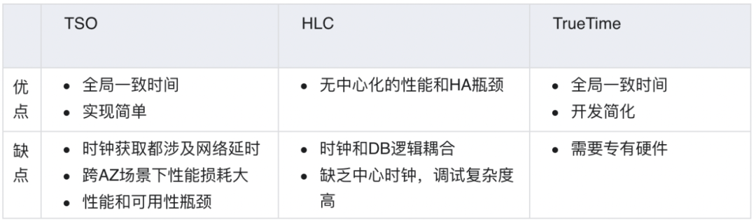业界的时钟解决方案分为三大类:TSO(全局发号器)、HLC(混合逻辑时钟)和 TrueTime。全局发号器方案的问题就是上面提到的可用性和性能瓶颈;CockroachDB 采用了 HLC 方案,HLC 没有中心化的性能和可用性瓶颈,但是这需要和 DB 逻辑耦合,实现复杂度高;Google 的 Spanner 采用的是 TrueTime 方案,它是一个完美的方案,但是需要依赖专有硬件。