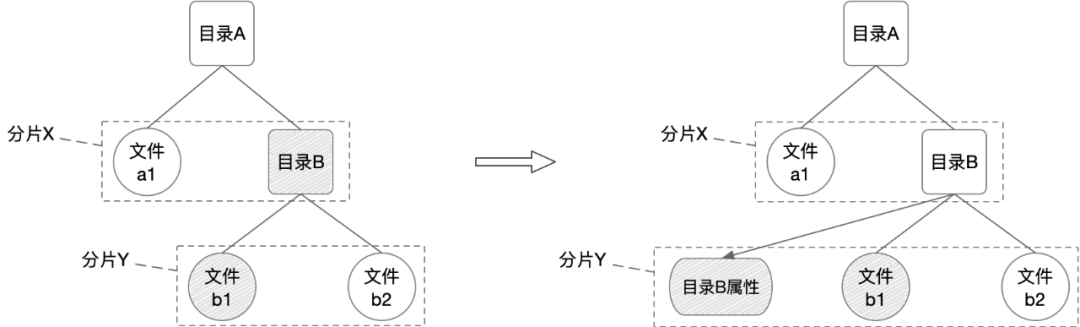 针对层级 Namespace:TafDB 提供了一种自定义分裂策略的功能,来保证同层目录元数据分片不分裂。同时业务调整表结构,控制一次目录树要操作的节点都在同层目录。这样就可以把绝大部分目录树操作都控制在单个分片上。如图所示,对文件 b1 操作涉及文件 b1 和其父目录 B 的元数据修改,原本需要通过分布式事务同时完成分片 X 和 Y 的数据写入。而优化后,我们将目录 B 需要修改的部分属性也放在分片 Y 中,这样只需写分片 Y 即可。
