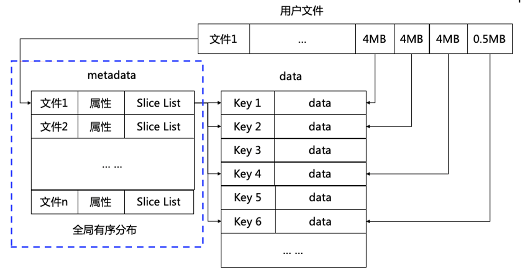 平坦 Namespace 主要存储一个对象的文件块的位置信息列表,一个对象文件分成了 N 个小块,每个小块文件都存储在数据面系统中,这个对象文件的块位置列表则存储在平坦 Namespace 中。逻辑结构如下图所示:
