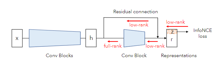 有人可能会认为DirectCLR 中的对比损失没有在表示向量r[d0:]的其余部分应用梯度,事实上,整个表示向量r 经过训练并包含有用的信息。表示向量的其余部分通过残差连接从最后一个剩余块之前的层复制。表示的这一部分不直接经历来自损失函数的梯度,而是通过卷积块由梯度更新,残差连接通过最后一个卷积块的满秩梯度。