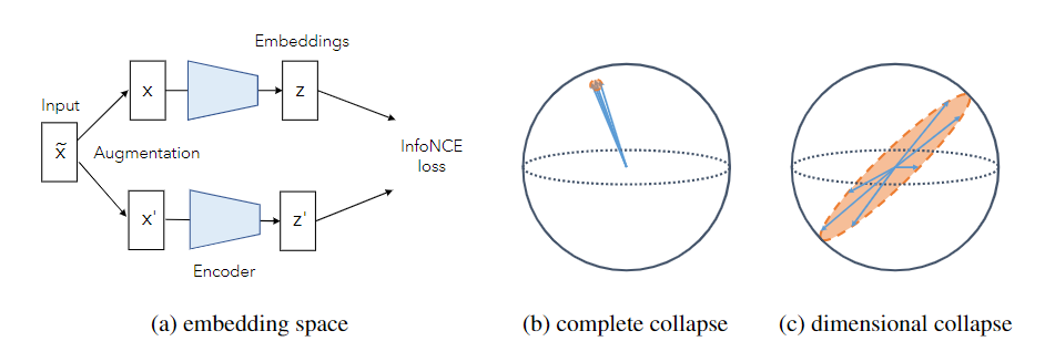 但自监督模型存在崩溃问题,即将所有输入映射到同一常数向量,因此研究人员提出了各种方法来解决该问题,这些方法依赖于不同的机制,虽然成功地防止了所有表示向量收缩到单个点的完全崩溃情况,但在非对比学习方法中可以观察到,虽然嵌入向量不会完全崩溃,但它们会沿着特定的维度崩溃(dimensional collapse),这导致嵌入向量只能在较低维度的子空间中有效。