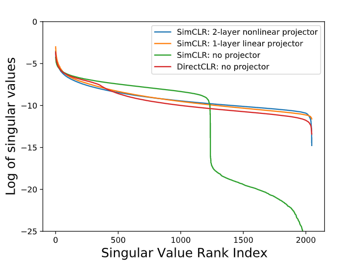 从经验上看,增加projector可以显著提高学习到的表现和下游表现的性能,检查表示层的spectrum也会发现有无projector的差异。研究人员训练了两个带projector和不带projector的SimCLR模型,当模型在没有projector的情况下进行训练时,SimCLR 会发生表示空间中的维度崩溃。