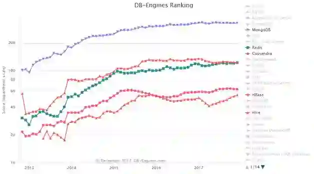 再把目光延伸至top20,就会惊人地发现,NoSQL家族正在爆炸式崛起。MongoDB、Redis、Cassandra、HBase和Hive年轻气盛,一路飙升,从2014年到2017年均已实现分值翻倍(图2)。稳坐非关系型数据库第一把交椅的MongoDB,从2009年的首度推出到现在不过十年,便已跻身top5,其发展潜力让人期待。
