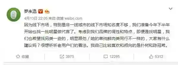 只不过这次他可能真的要兑现承诺了,早在今年4月份,罗永浩就表示有机会的话会找陈冠希做其代言人。 罗永浩称,准备在今年下半年找明星代言,但考虑到自家品牌的调性和特点,因此想请另类一些的明星,随后罗永浩给出了自己的心中人选: 朴树和陈冠希。 之后罗永浩在评论区回复称,“就看陈老师的经纪公司能不能谈下来了”。