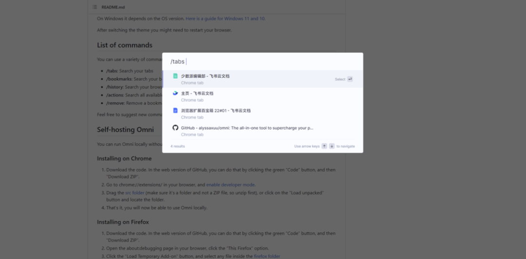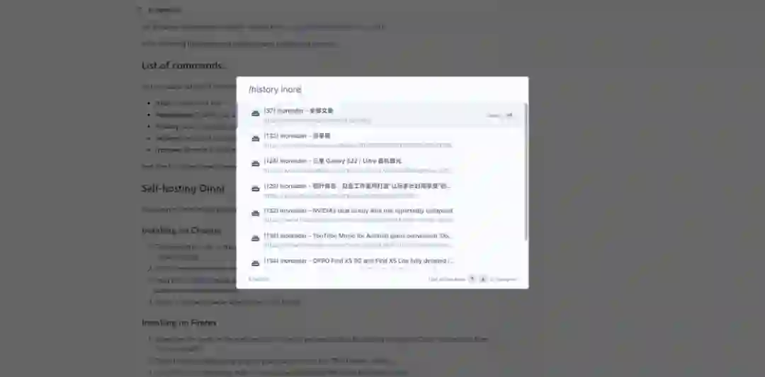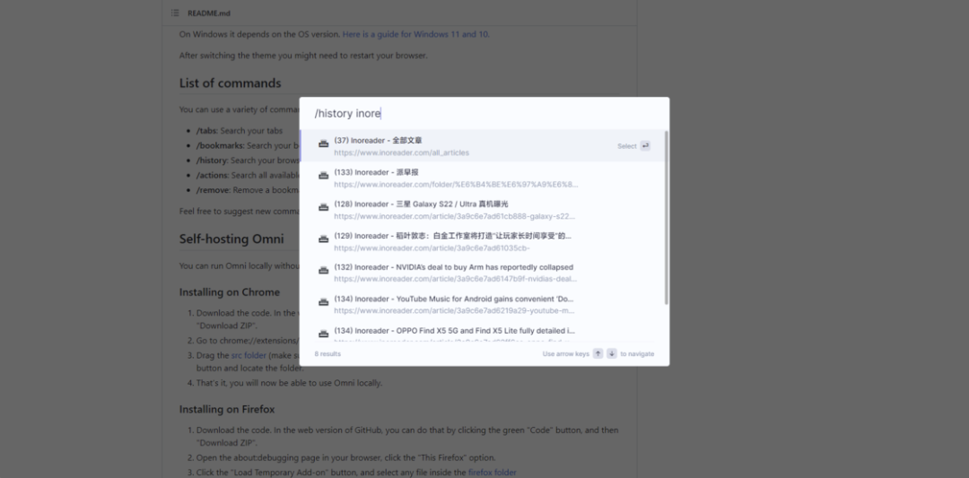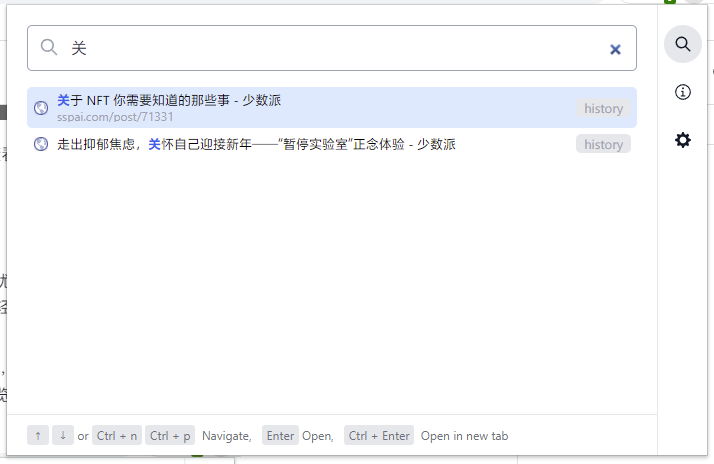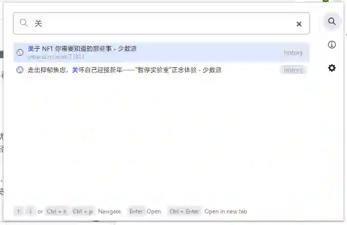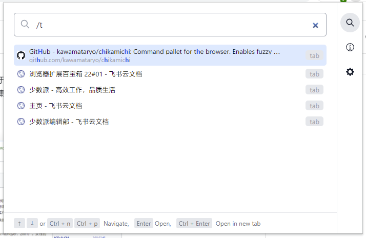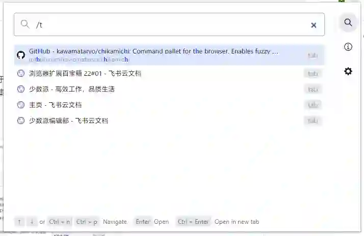 如果你觉得 Omni 挺不错但其搜索框样式侵入性太强了些,比较干扰正常的浏览体验;或者觉得 Omni 整合的大量第三方应用操作自己实在用不上,需要一些更加简单、轻量的选择,Chikamichi 就是为你准备的。Chikamichi 的整体理念和 Omni 类似,设计上没有 Omni 那么精致,与 Chrome 一起使用倒是并不违和。使用快捷键 Alt+K 呼出后,我们可以键入任何关键字来在浏览器本地的历史记录、书签和已经打开的标签页中进行搜索。基于本地的模糊搜索同时,Chikamichi 也提供了命令来限制搜索范围,比如 /h 为仅在历史记录中搜索,/t 为仅在已打开标签页中搜索,用起来同样是简单快速。同样支持快捷键搜索Chikamichi 支持 Firefox、Chrome 和 Edge,你可以在 GitHub 页面查看下载地址。▍Blackbox