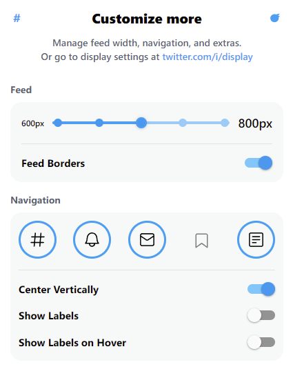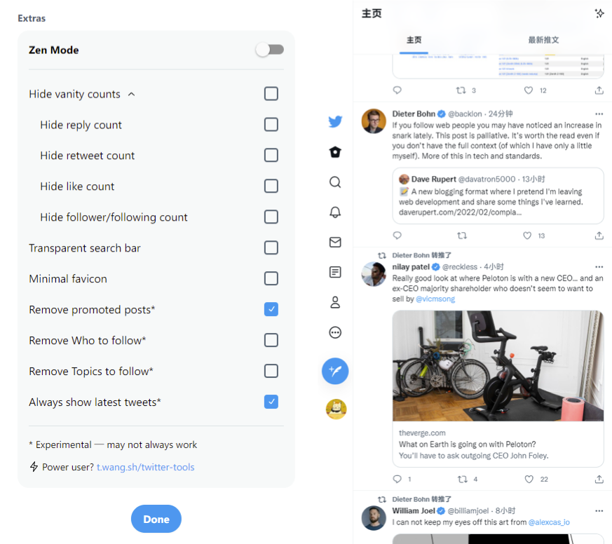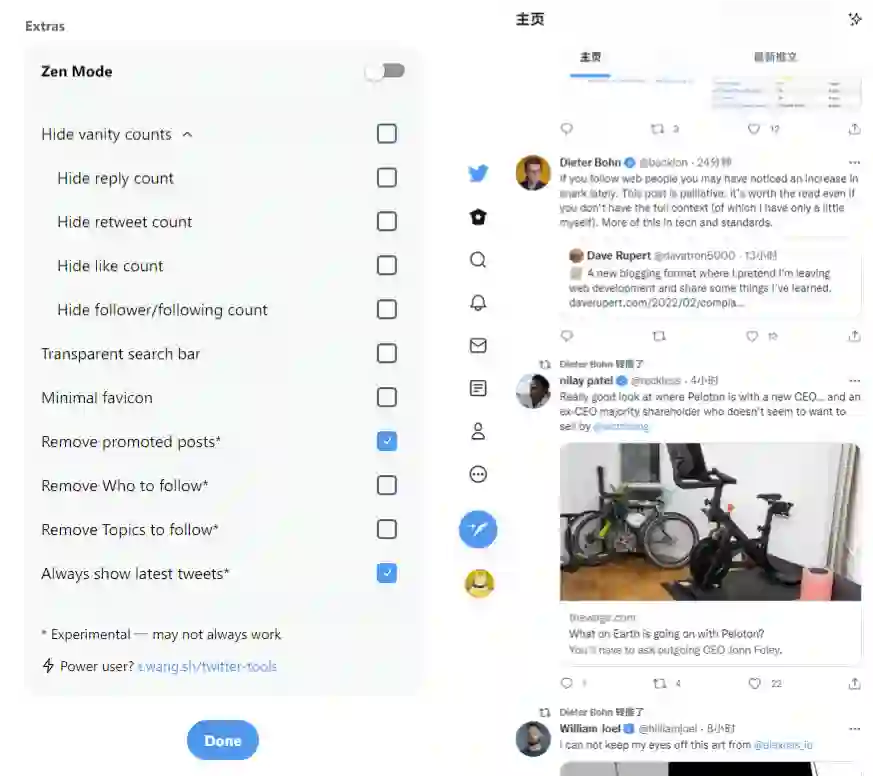 市面上针对网页样式进行精简和改造的扩展不少,这款 Minimal Theme for Twitter 主要则是为了让我们的刷推体验更加清爽一点。开启前的默认效果开启扩展后,我们可以自由定制左侧导航菜单的呈现方式以及时间流的边距、大小,算是对 Twitter 官方「显示」设置的适当延展。自定义设置此外,在 Zen Mode 中我们还可以根据实际需要隐藏 Twitter 网页版右侧的「新鲜事」和关注建议,去掉右下角与左侧导航菜单重复的私信面板,以此获得更加干净的浏览体验。比较有意思的是,Zen Mode 还提供了隐藏计数的功能,让刷推回归推文内容本身,不被评论、点赞和转发数量所引导。在大屏设备上,比如桌面端,如果将能够精简的部分都精简掉,会发现 Twitter 页面变得有一点空荡荡的。因此个人更加推荐在开启导航图标垂直居中、隐藏和时间流无关的板块之后,在平板设备或搭配 PWA 应用打包使用,获得原味、无干扰的刷推体验。完全开启后的效果如右图Minimal Theme for Twitter 支持 Firefox、Chrome 和 Edge 浏览器,你可以前往官网免费下载。▍Hack This Page
