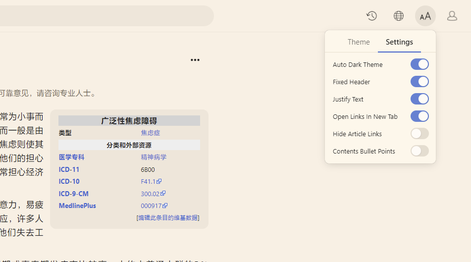 在流量和带宽宝贵的时代,页面所承载的信息量,优先级一般是高于页面设计的。如果你偶尔需要在维基百科上查阅资料,应该也会发现维基百科的页面虽然信息量密集,但整个页面的设计和排版放在当下总显得有些「老气」。开启前的效果因此对维基百科用户而言,Modern Design for Wikipedia 非常适合安装后长期留在扩展菜单里。相比原版,开启扩展后的页面采用了大量现代的圆角设计元素,同时视觉上更加清爽。普通用户在浏览过程中一般不会用到的帮助、工具等菜单均被精简或收纳进页面左上方的二级菜单,页面左侧的导航工具栏则被替换成了在词条浏览过程中更为常用的目录。开启后的效果值得一提的是针对内容本身 Modern Design for Wikipedia 也提供了丰富的定制选项,包括主题样式、标题样式、文本对齐、链接打开偏好等等。丰富的文本与样式设置Modern Design for Wikipedia 支持 Firefox、Chrome 和 Edge,你可以前往官网 免费下载。关注少数派,在后台回复「0211」即可获得下载链接。▍Minimal Theme for Twitter