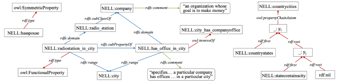 (1)我们首先利用RDFS中的术语定义schema graph的基本结构,不同于一般KG中关系被建模为实体间的连接边,在schema graph中,关系也可以出现在实体的位置,以此建模关系之间的关系,即元关系。具体地,我们利用rdfs:subPropertyOf定义关系间的层次关系,rdfs:domain和rdfs:range定义分别定义关系的头尾实体类型约束,以及rdfs:subClassOf 定义实体类型的层次结构,下图展示了该 schema的一个片段。
