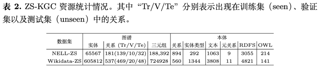 我们以ZS-KGC任务的两个基准数据集NELL-ZS和Wikidata-ZS为例构建了该资源,资源的统计信息如下表所示。