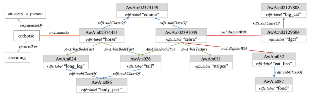 (2)该资源还可应用于为ZSL模型提供可解释性。图谱中包含的类别间的共享知识可以很好地为类别间特征的可迁移性提供佐证。相比于使用通用域知识图谱为模型提供可解释性,我们所构建的知识图谱资源更加领域适配;