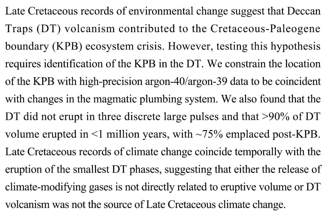 (导读 过泽远)白垩纪晚期环境变化记录暗示德干地盾(DT)火山活动可能导致了白垩纪-古近纪(KPB)生态危机。本文用高精度氩-40/氩-39数据来确定KPB的位置,发现DT并未出现三次大喷发,90%的喷发在不到100万年内完成,75%出现在KPB后。晚白垩世气候变化仅与最小喷发阶段短暂一致,暗示DT火山活动在大灭绝中的作用可能仍不明确。