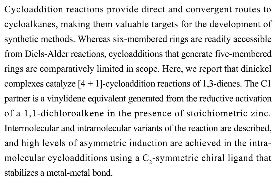 (导读MQ)环加成反应为合成环烷烃提供了更加直接和汇聚式的路线,从Diels-Alder反应中很容易得到六元环产物,而五元环加成产物不易获得。研究人员报告了一种Dinikel配合物催化1,3-二烯的[4+1]环加成反应,具有两个镍中心的催化剂可以使这种反应产生五元环产物。催化剂的手性形式使反应在分子内情况下具有对映选择性。