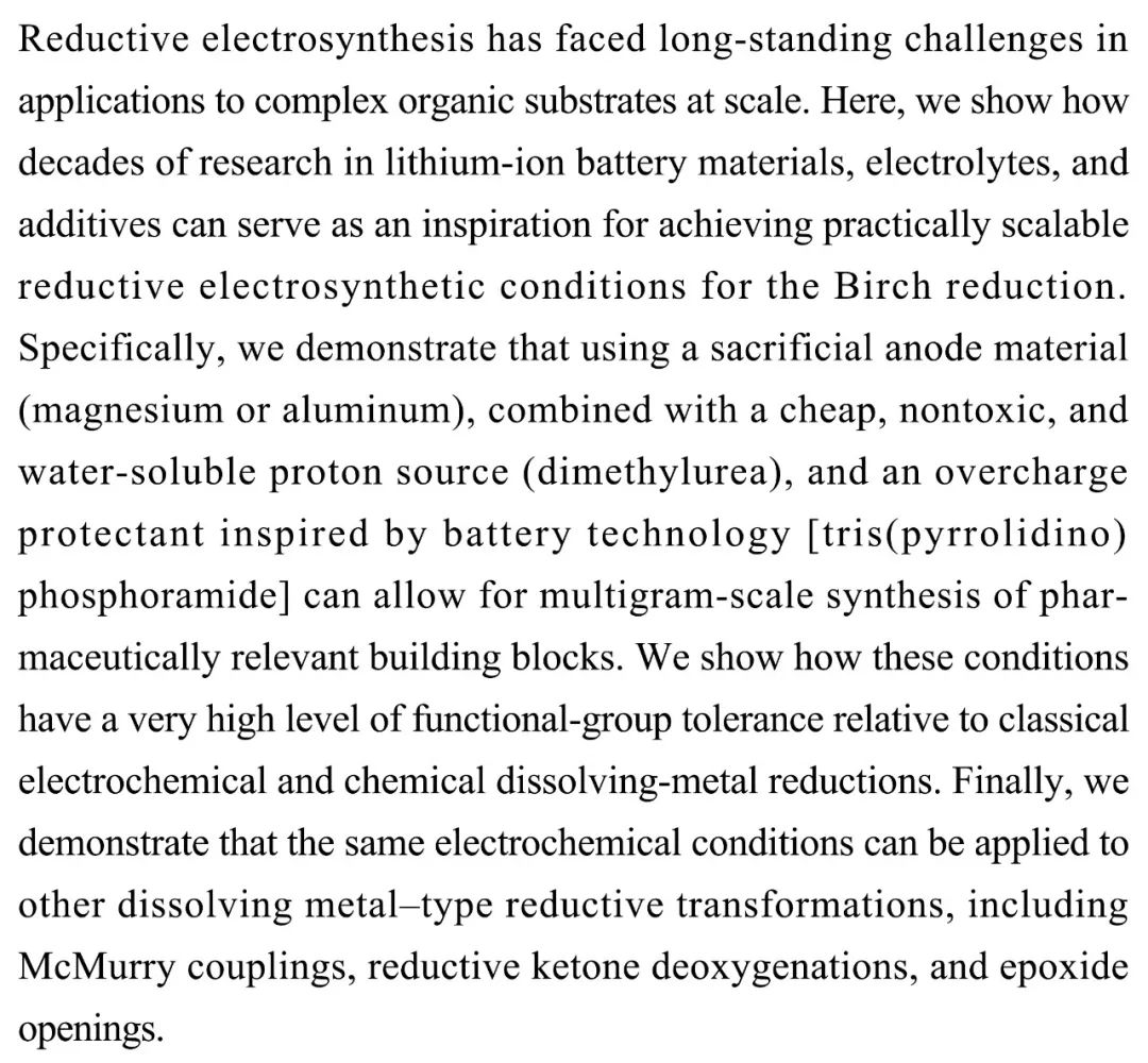 (导读MQ)合成有机电还原在大规模复杂有机合成的应用中面临长期挑战。研究人员证明使用牺牲阳极材料,结合廉价无毒的水溶性质子源,以及受电池技术启发的过充安全保护剂可以用于药物相关结构单元的克级规模合成。与传统的电化学和溶解金属还原反应相比,这些条件具有非常高的官能团耐受性,并能应用于其它溶解金属型还原转化。