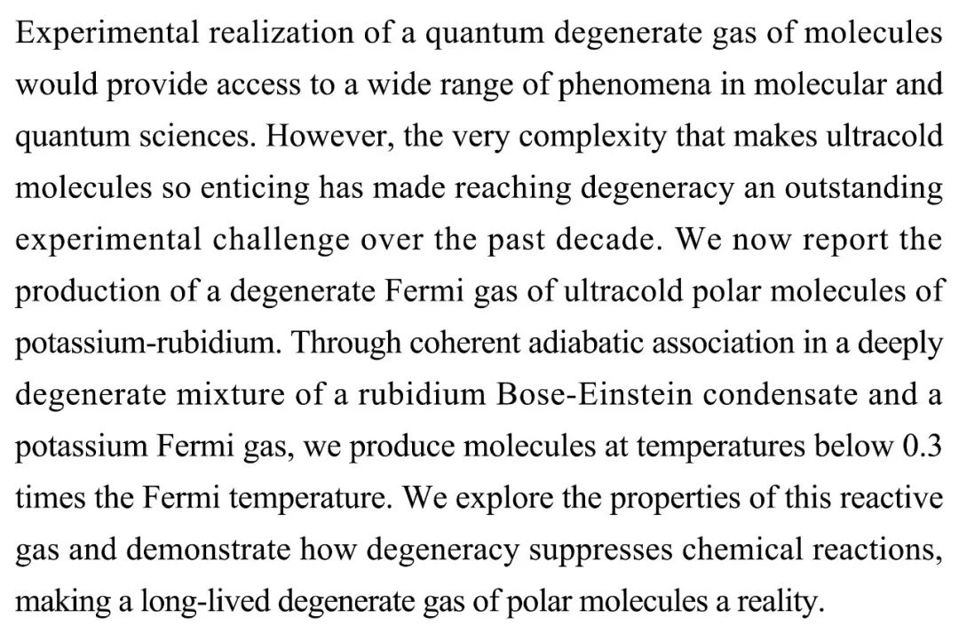 (导读 阿金)通过实验实现分子量子简并气体有助于更广泛地研究分子和量子科学中的各种现象。本研究报道了通过对铷玻色—爱因斯坦凝聚体和钾费米气体深度简并混合物的耦合绝热关联,在低于0.3倍费米温度下成功制造出钾—铷超冷极性分子的简并费米气体,并进一步探索了该气体的特性。
