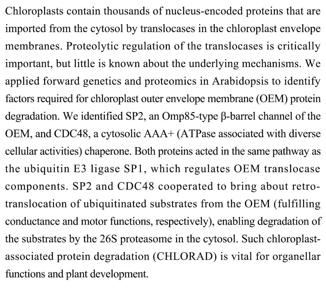 (导读 过泽远)叶绿体相关蛋白降解对细胞器功能和植物发育至关重要。本文通过遗传学和蛋白质组学确立了拟南芥叶绿体外膜(OEM)蛋白降解所需的因子(SP2和CDC48)。这两种蛋白因子的作用途径与泛激素E3连接酶SP1相同,导致泛素化底物的逆转录易位并使其在细胞溶胶中被26S蛋白酶体降解。