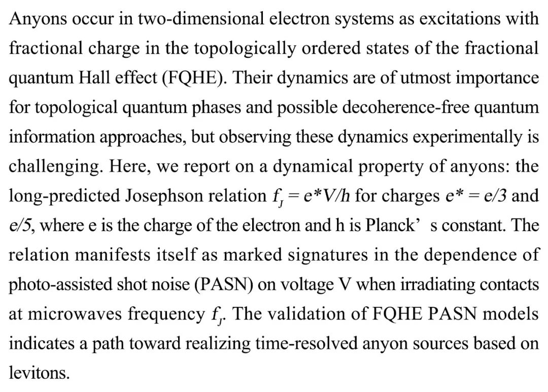 (导读页一)目前对分数量子霍尔效应(FQHE)中任意子的动力学实验观测仍具挑战。本研究通过探究接触区在微波照射下散粒噪声(PASN)与电压的关系从实验上展示了任意子的约瑟夫动力学关系。FQHE PASN模型的验证为进一步研究时间分辨的任意子源指明了方向。