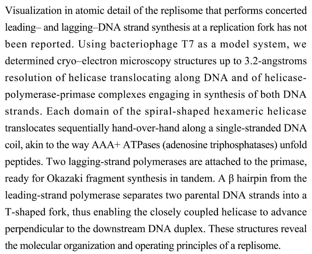 (导读 郭怿暄)复制体协调复制叉处前导链和后随链DNA的合成机制尚不明确。本研究解析了噬菌体T7的解旋酶DNA易位以及合成双链DNA的解旋酶-聚合酶-引物酶复合物的冷冻电镜结构。发现解旋酶的每个结构域沿单链DNA依次交替易位。两个后随链聚合酶结合引物酶准备好冈崎片段的串联合成。前导链聚合酶A β发卡将两条亲代DNA链分隔成T型叉,使得紧密耦合的解旋酶垂直地移向到下游DNA双链。