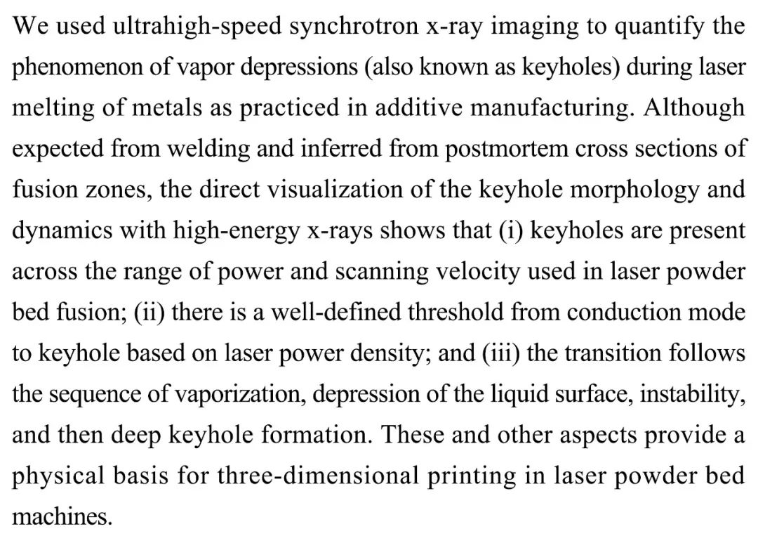 (导读 卓思琪)本研究用超高速同步加速X射线成像,对增材制造中激光焊接时产生的蒸汽填充凹槽(也叫做锁孔)进行了量化。 研究结果表明:i)锁孔的形成与激光粉末床的功率、扫描速度范围有关;ii)基于激光功率密度判断出导电性和锁孔有明确阈值;iii)过渡态按照经过汽化、液面凹陷、形成不稳定形态,然后形成了锁孔。该研究为激光粉末床三维印刷提供了物理基础。
