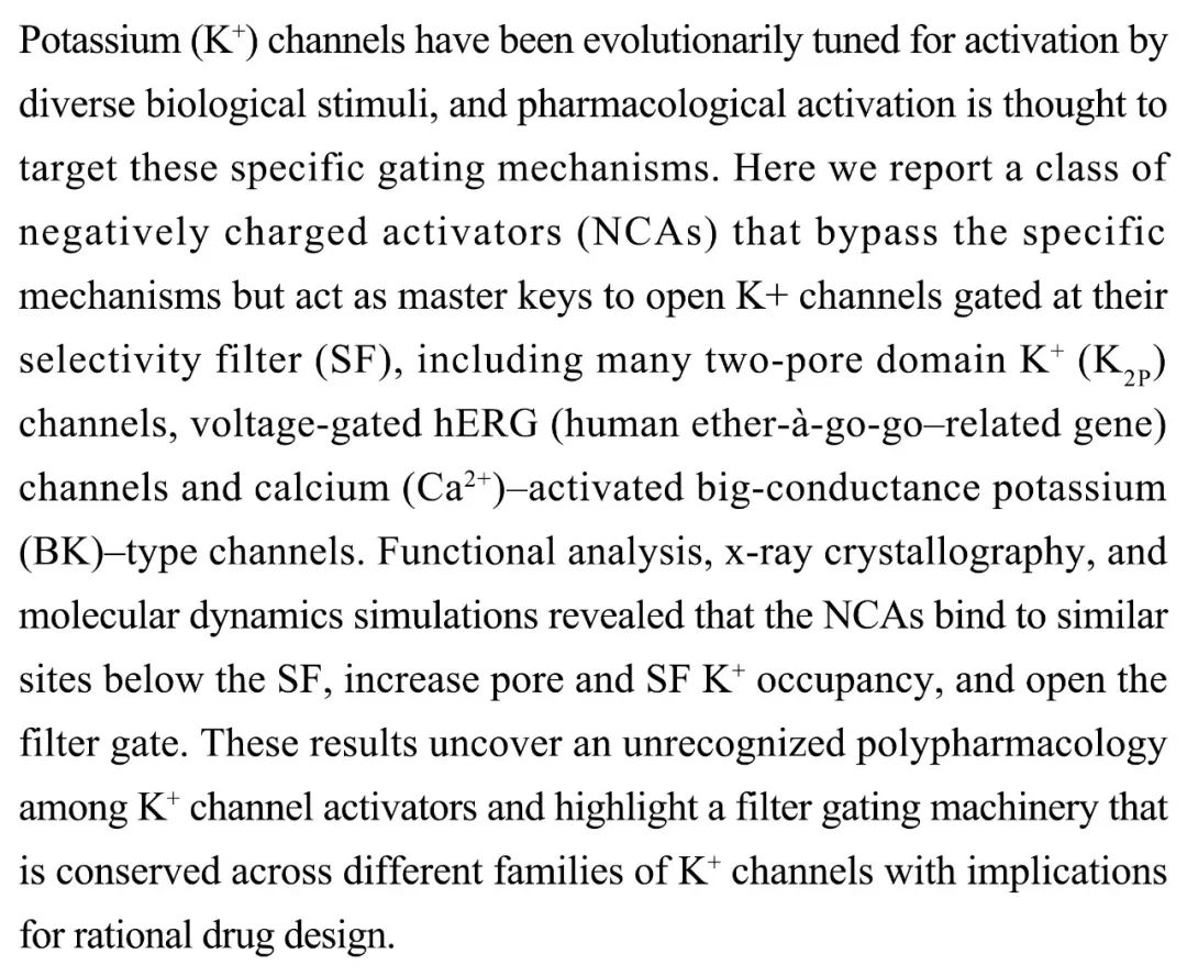 (导读MQ)使用药物激活钾通道有可能治疗癫痫、心律失常和疼痛等疾病。本研究发现一类带负电荷的激活剂(NCAs)可绕过特定机制,打开多种类型钾通道的选择性滤器。X射线晶体、功能分析和分子动力学模拟显示:NCAs结合在钾离子通道中的选择性滤器下方,增加孔和滤器的钾离子结合,从而打开滤器。该结果揭示了多家族钾离子通道间保守的过滤门控机制,可用于药物设计。