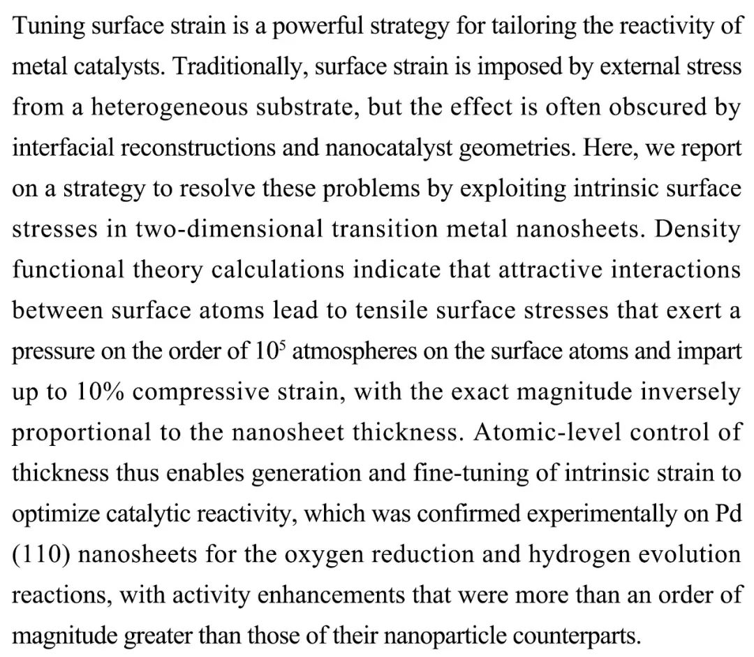 (导读 页一)金属催化剂的活性可通过表面应变去调节,但目前主要受界面重构和几何的限制。本研究通过调节二维过渡金属纳米薄层固有的表面应力来解决这些问题。密度泛函理论的计算表明,表层原子之间的吸引作用导致催化剂内部产生压缩应变,同时结合Pd(110)纳米薄层的氧还原和氢生成反应实验验证了通过调节催化剂应变从而对其活性进行微调的可行性。