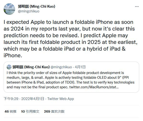 郭老师去年预测苹果发布折叠屏手机最快也要等到 2024 年,但是今天他再次预测最早要等到 2025 年。他表示苹果的首款折叠屏设备要么是混合 iPhone 和 iPad 的一款产品,要么就是一个折叠屏 iPad。