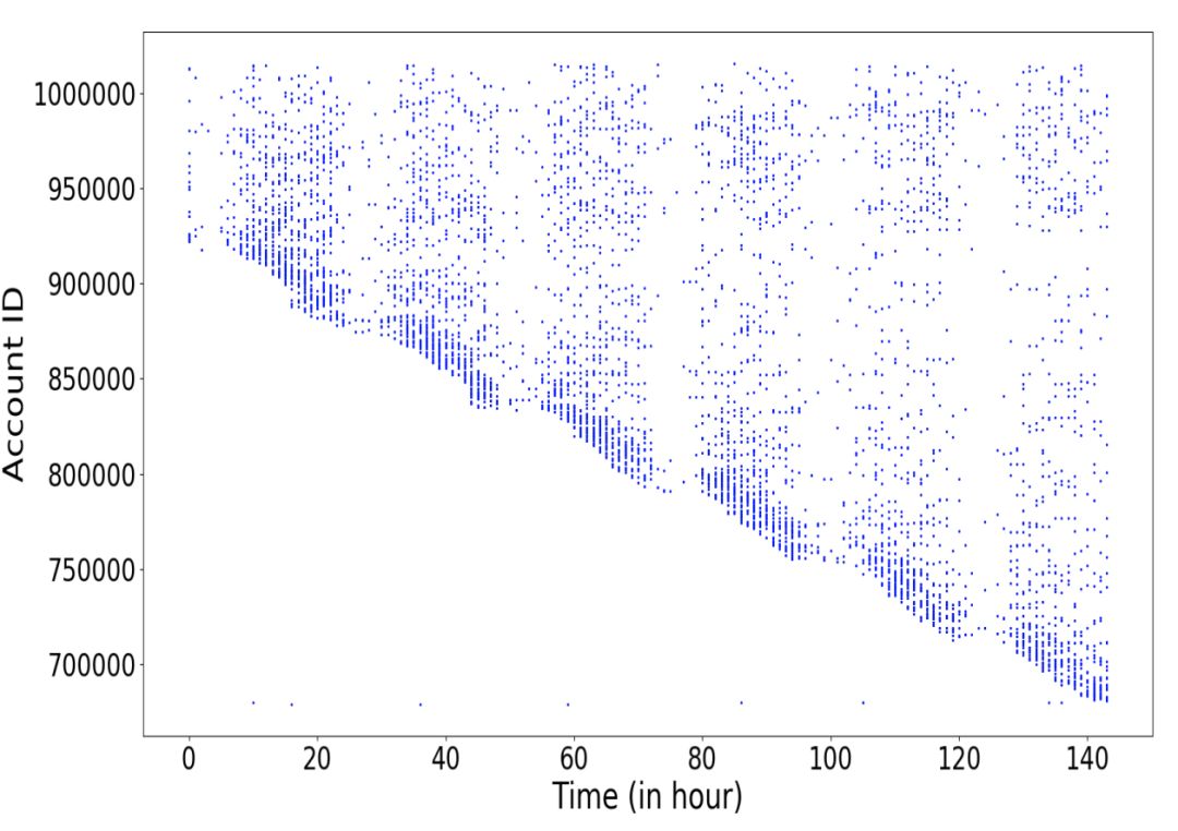 如上图所示,横轴是时间轴,纵轴是账户 ID,可以看到,有风险的账户在时间上面的聚集性是非常明显的,而正常账号的行为是比较分散的。