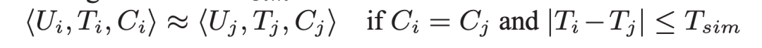 U是指账号,T是指行为发生的时间戳,C就是限制资源(两个账号有相同的行为,使用同一个 IP,或作用对象一致都可以作为限制资源),如果两个账号的行为的时间间隔小于 Tsim ,那么可以认为这两个行为是一致的。