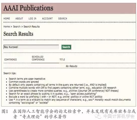 在库兹韦尔的主页上[4],他和比尔·盖茨的合影映入眼帘,他把自己描绘成一个“不知疲倦的天才”和一个“终极思考机器”,并称自己是语音合成等多项重大技术的发明人。事实是否如此呢?笔者检索了国际权威的人工智能组织——国际人工智能学会(AAAI)论文库,并未发现库兹韦尔或者其“奇点理论”的任何论文(如图1所示)。在德国DBLP论文库检索中,笔者发现库兹韦尔最近20年仅有的几篇文章要么是没有具体技术内容的摘要,要么是没有任何基于数据和科学实验的口水文章。也许有人会说,库兹韦尔不写科学论文,是个实践性发明人才。事实是否如此呢?库兹韦尔说他发明语音合成和语音识别这两点成立吗?