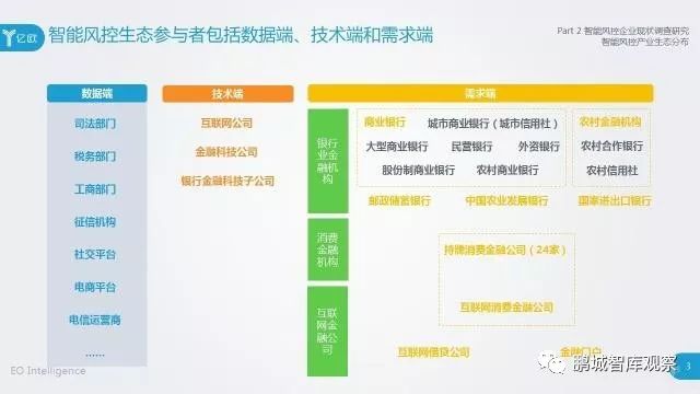 金融机构智能风控的技术服务,可以将其分为三类:互联网公司、银行金融科技子公司和金融科技公司。其中互联网公司是从数据端切入信贷风控业务,而创新型公司大多从技术端切入。征信企业作为中小微企业信贷授信过程中的衍生机构,随着大数据采集技术的成熟和数据量的积累,也在积极利用大数据、人工智能等技术推进智能化征信体系建设。