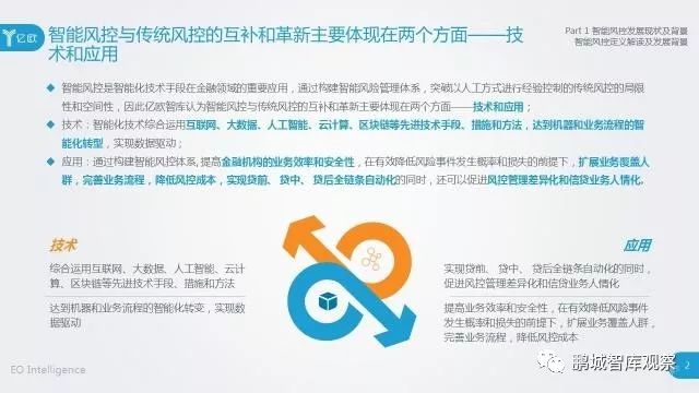市场上对于智能风控的定义还受限于大数据风控,定义片面甚至混乱。随着人工智能发展进入落地阶段,对于“智能”的定义已不局限于大数据或者人工智能等技术的应用。亿欧智库通过企业拜访和专家调研,智能风控与传统风控的互补和革新主要体现在两个方面——技术和应用,而政策、经济、社会、技术多项利好因素推动智能风控产业发展。