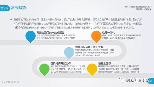 随着智能风控的火热布局,国家政策的积极推进,智能风控进入快速发展阶段。但是从目前发展存在的困难和挑战考量,智能化技术如何更好地服务于信贷业务,还需要经过更多市场的考验。信贷业务发展多年,如何利用智能风控理想化地实现智能,未来智能风控会向怎样的方向发展,通过对市场的了解和各类企业对于智能风控的理解,亿欧智库提出了几点趋势预测。