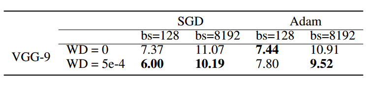 表 1:VGG-9 使用不同的优化算法和超参数在 CIFAR-10 上的测试误差。