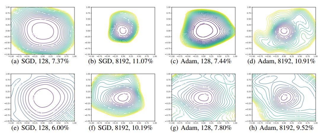 图 4:使用不同的优化算法得到的极小值的形状,其中使用了不同的批尺寸和权重衰变率。每个子图的下方标出了优化器、批尺寸和测试误差。第一行使用的权重衰变率为 0,第二行使用的权重衰变率为 5e-4。